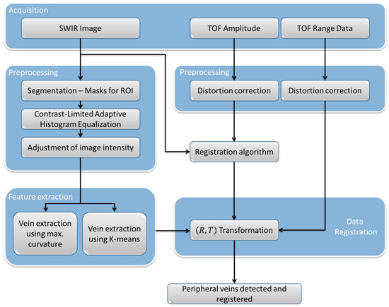 Figure 2 shows a block diagram of the proposed algorithm, which consists of two main parts: one devoted to the features extraction from the SWIR image, and another envisaged for the registration of the range data provided by the TOF camera, with the SWIR image and the results of the peripheral veins detection.