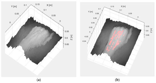 Figure 13a,b shows the vein detection results obtained with the adapted maximum curvature method and the method based on the k-means clustering, respectively. Finally, Figure 14a displays the obtained result after registering the TOF data with the original SWIR image, while Figure 14b illustrates the mapping of the veins detected with the method based on the k-means clustering onto the 3D reconstructed surface, after applying the proposed registration algorithm. Note that in the three presented experiments, only the registration results obtained with the detection based on the k-means clustering are displayed. This is due to the fact that the method based on the adapted maximum curvature provides a low number of image pixels identified as vein, which demerits the registration results. On the contrary, the detection method based on the k-means clustering provides a higher a proportion of image pixels that are correctly identified as vein, and consequently, fits better as input for the subsequent registration procedure, improving performance results.
