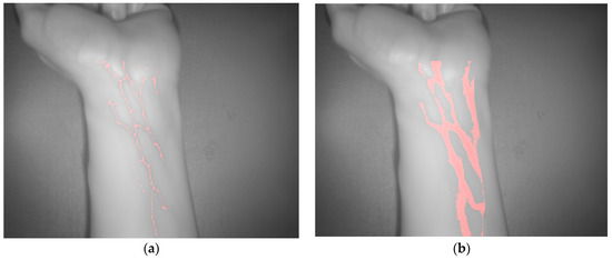 Test 2—Vein extraction. (a) Results from applying the proposed preprocessing and the adapted maximum curvature method; (b) Results from applying the method based on the k-means clustering.