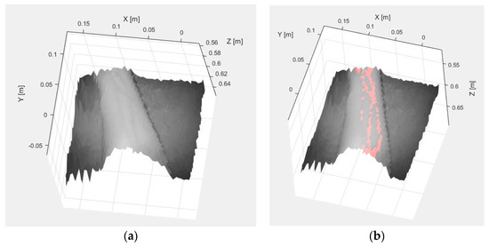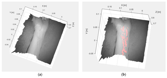 Figure 9a,b shows the results obtained after applying the adapted maximum curvature method and the method based on the k-mean clustering, respectively. Next, Figure 10a displays the obtained result after registering the TOF data with the original SWIR image, and Figure 10b illustrates the SWIR-D visualization obtained after applying the proposed registration algorithm. In this SWIR-D visualization, the subcutaneous veins detected on the SWIR image with the method based on the k-means clustering are mapped onto the 3D reconstructed surface. Lastly, the third experiment is intended to evaluate the detection and localization of subcutaneous veins on the anterior view of the forearm. Figure 11 and Figure 12 display the dataset acquired with the proposed multisensory system, including a SWIR image (Figure 11a), a TOF amplitude image (Figure 11b) and a raw point cloud provided by the TOF camera (Figure 12).