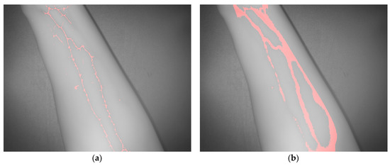 Test 3—Vein extraction. (a) Results from applying the proposed preprocessing and the adapted maximum curvature method; (b) Results from applying the method based on the k-means clustering.