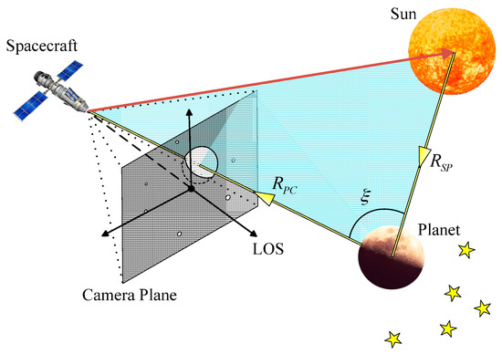 Figure 1 shows the spatial position relationship between the navigation sensor and the observed target. A planet typically emits energy in a manner that reflects solar radiation energy. The irradiance of the sun is assumed to be isotropic because the irradiance is inversely proportional to the square of the distance [22]. Thus, the irradiance received at the target celestial surface is expressed as: