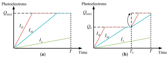 The total integration time is divided into several time segments when the WCA scheme is utilized. The well capacity is adjusted to a higher value at the beginning of each time segment until it increases to the full well capacity. The accumulated photoelectrons are a piecewise linear function with respect to the integration time. Figure 3b shows that the integration time is divided into two segments, namely, and . is designated as the adjusting integration time (AIT) at this point. The well capacity is adjusted from to the full well capacity at time . Notably, when the accumulated photoelectrons reach (e.g., the high irradiance signal () case in the figure), the output photoelectrons are clipped until time . The excess photoelectrons will spill over from the lateral overflow gate. However, the accumulated photoelectrons of the low irradiance signal () are unaffected. Therefore, the accumulated photoelectrons of a pixel when using the WCA scheme can be expressed as: