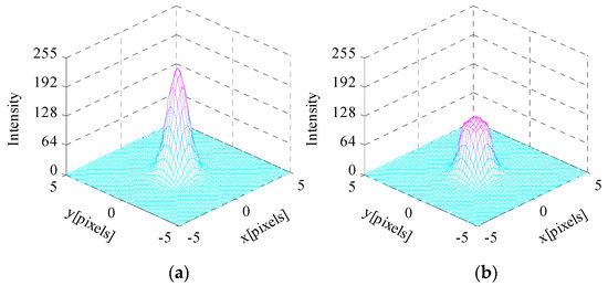 Establishing an accurate star spot imaging model is the first step to achieving high star centroiding accuracy. Stars can be considered point sources at infinity. Stellar rays can be approximated to parallel light rays. Incident stellar lights pass through the optical lens and are focused at a point in the focal plane. However, the lens is generally slightly defocused to improve the centroiding accuracy of a star spot, which spreads to several pixels in the image plane. The profile of a star spot can be described by the Gaussian PSF, whereas the parameter Gaussian PSF radius indicates the extent of dispersion. When is high, the region where a star spot spreads out is large. The star spot imaging model in normal integration mode commonly assumes a 2D Gaussian function (Figure 7a) and can be expressed as: