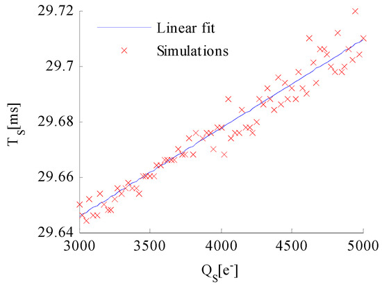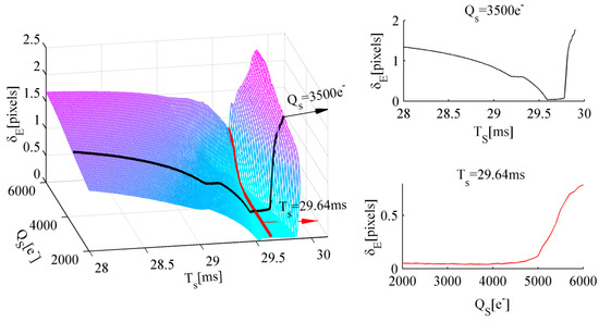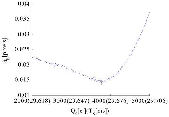 The simulation results of the optical system in this study are shown in Figure 13. The abscissa denotes the well capacity , whereas the values in the parentheses denote the optimal that correspond to the current . The edge detection error initially reaches the minimum number and then increases with the increase in . The symbol “*” indicates the optimal . Thus, the optimal solutions for the exposure parameters are identified. The optimal well capacity of the navigation sensor of the optical system employed in this study is 3750, whereas the optimal AIT is 29.67 ms.