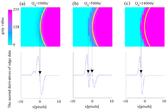 In Figure 9, the purple color represents the saturated pixels, whereas the cyan color represents the pixels with zero intensity. The yellow arc represents the true edge of the celestial body. The red cross symbol indicates the zero-crossing point of the second derivative, which is located at the true edge location, whereas the blue circle symbol indicates the zero-crossing point that deviates from the true edge location. Figure 9a shows that the intensity of the energy ring is small when the well capacity is small and that the zero-crossing points can be extracted at the actual edge location. Figure 9b shows that the intensity of the energy ring increases with the increase in and that the zero crossing points exist at the location of the energy ring. The algorithm extracts double edges, and the false edge can be rejected. Figure 9c shows that the intensity of the energy ring is higher with a larger and that no zero-crossing points are obtained at the actual edge location. The extracted edge deviates from the true location. Thus, a large value results in false edge extraction.