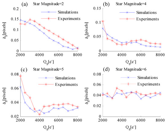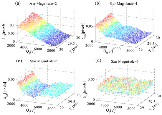 After adding temporal noise and fixed pattern noise to the simulated star image, the relationship among , , and is analyzed with different star magnitudes. Figure 10 shows the simulated results when the star magnitude is 2, 4, 5, and 6. First, the relationship between star centroiding error and AIT is discussed. Figure 10a shows that the centroiding error of the star magnitude = 2 slowly increases with the increase in . Figure 10b–d shows that the centroiding error variation caused by can be neglected. Thus, is less affected by . Second, the relationship between star centroiding error and well capacity is discussed. Figure 10a–c shows that decreases with the increase in . However, the centroiding error variation of a dim star (Figure 10d) caused by well capacity can be neglected.
