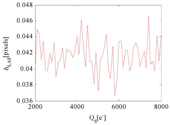 In Equation (25), is the function of the Gaussian radius , well capacity , total integration time , AIT , incident flux of the star on the image plane , and actual star location . is determined by the limiting detectable star visual magnitude for the navigation sensor. If moves within a pixel, then changes periodically. However, is a random variable that is uniformly distributed over a pixel within the range [−0.5, 0.5) in practice. The root mean square error is defined as the error of x, as: