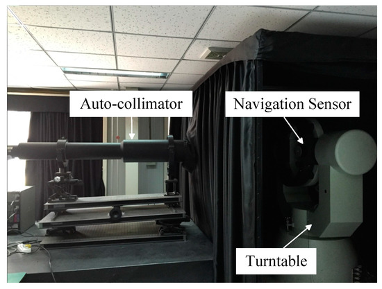 A laboratorial single-star imaging and accuracy analysis experiment is performed to validate the star spot imaging model and centroiding accuracy performance when the WCA scheme is employed. The autocollimator in the laboratory is used to generate infinite distance star signals with different star magnitudes. The navigation sensor is mounted on a turntable, as shown in Figure 14.