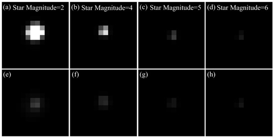 (a–d) Star images of magnitudes 2, 4, 5 and 6 when using the normal integration mode; and (e–h) star images of magnitudes 2, 4, 5 and 6 when using the WCA scheme.