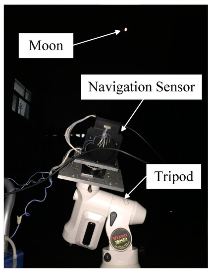A night sky observation and accuracy analysis experiment is performed to validate the correctness of the celestial body edge model and optimal exposure parameters when the WCA scheme is applied. Moreover, whether the optical navigation measurements of the stars and target celestial body from the image by a single exposure with the optimal exposure parameters satisfy the requirements of navigation accuracy is validated. In Figure 17, the navigation sensor is installed on a tripod. The hardware configurations of the navigation sensor are the same as those previously mentioned.