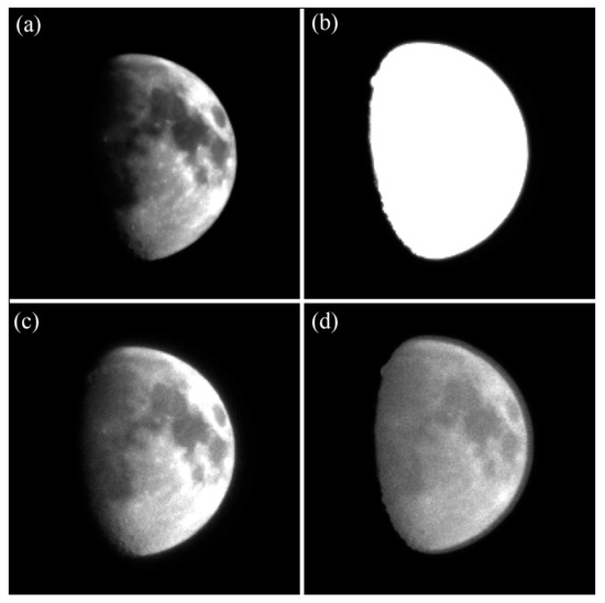 Lunar images with different exposure parameters: (a) utilizing the normal integration mode; (b) utilizing the normal integration mode; (c) , utilizing the WCA scheme; and (d) , utilizing the WCA scheme.