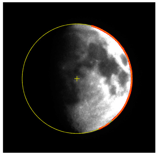The theoretical value of the apparent diameter of the Moon is estimated to be 71.02 pixels on the image plane by applying the STK software to simulate the distance from the observation location to the Moon. The edge detection algorithm is employed to extract the edge of the Moon. The least squares circle fitting is utilized to obtain the apparent radius and centroid of the Moon image. The results are shown in Figure 19.