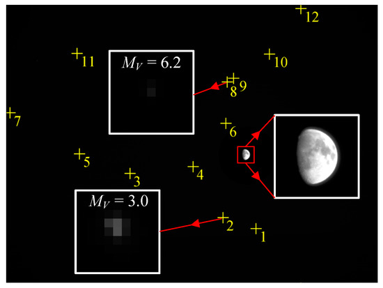 Images of stars and the Moon in the same FOV are taken utilizing the WCA scheme and optimal exposure parameters, as shown in Figure 20. The star pattern identification algorithm is applied, and the identified stars are denoted with the yellow “+” symbol. A total of 12 stars are identified. The brightest star magnitude is 3.0, whereas the dimmest star magnitude is 6.2. The centroid positions and magnitude of the identified stars in the image are listed in Table 3.
