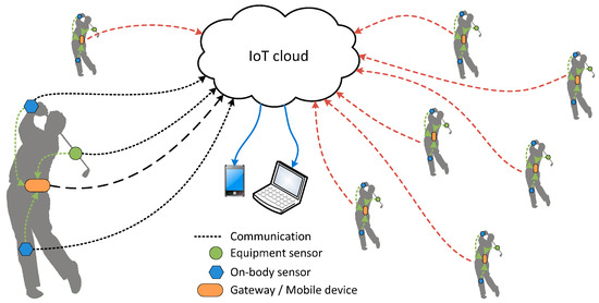 Data acquisition is done by the smart sport equipment sensors and on-body sensors in wearable devices; the presentation of results is performed by connected devices, as shown by blue lines in Figure 1. Many different sport IoT applications belonging to the one of the above basic groups are envisioned to be active at the same time. In Figure 1 they are represented by the minimized silhouettes connected to the cloud by red dashed lines.