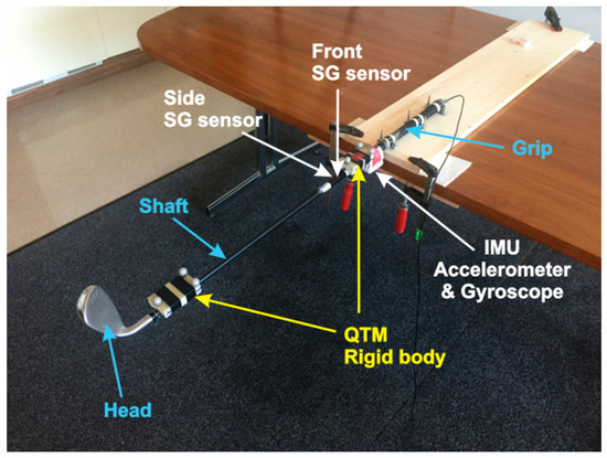 Smart golf club equipped with various sensors fixed to the shaft at different positions: the IMU device with 3-axis accelerometer and 3-axis gyroscope is just below the grip; two SG sensors pasted orthogonally to each other along the shaft’s axis; Two independent rigid bodies used by the QTM optical system are fixed at the top and at the bottom of the shaft.