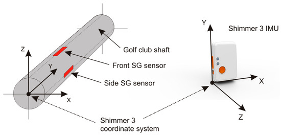 Graphical representation of the smart golf club shaft with two orthogonally placed strain gage sensors measuring the bends of the shaft in two orthogonal directions. The front SG senor is placed in the direction of the Z axis and side SG sensor in the direction of the X axis of the Shimmer 3 IMU device; both measured from the axis of the shaft.