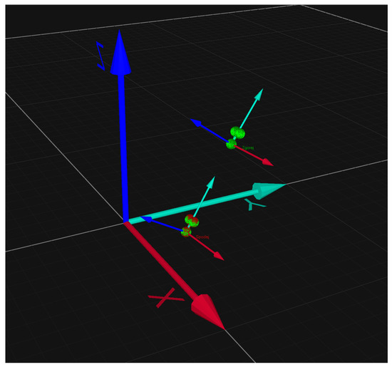 We used the optical motion capture system Qualisys™ as a reference for the 3D rigid body tracking. Qualisys™ is a professional, high-accuracy tracking system [19] with eight Oqus 3+ high-speed cameras that offers real-time tracking of multiple predefined rigid bodies. The placement of the two independent rigid bodies, each with three reflective markers, can be seen in Figure 2. One rigid body is placed just below the IMU and the other just above the head of the golf club. The position of both rigid bodies in 3D space is shown in Figure 4. The global coordinate system of the test space and two independent local coordinate systems of rigid bodies can also be seen in Figure 4.
