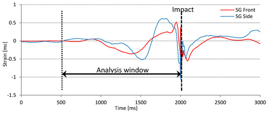 As described in Section 3.1.3, acquired sensor signals are synchronized and processed by the LabVIEW™ application. Because the communication paths from IMU and SG sensors have different latency, we perform impact detection separately for the SG signals and IMU signals. After real-time streamed sensor signals are aligned by their impact samples, they are segmented into separate swings. Each swing contains 1500 samples, where impact sample is always at index 1000. At the defined sampling frequency of 500 Hz the duration of each recorded swing is 3 s and impact point is at 2 s. The relations between the recording and analysis window are presented in Figure 5. In the graphs presented later in this paper we plot only swing signal samples between indexes 250 and 1000 (impact) or 1.5 s time frame. For our analysis, aimed at later use in real time biofeedback system, this is the most significant part of the swing. The signal recorded before the start of the movement is considered to be noise and signal after the impact is irrelevant for real time biofeedback as it occurs too late for action. Even more, for motor learning accelerating application the feedback should happen before the downswing phase, what is approximately 250 ms before impact.