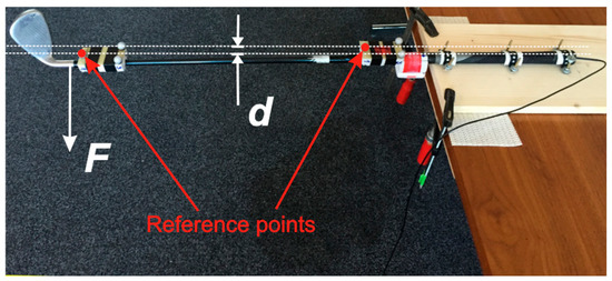 A static test is performed with the club’s grip firmly affixed to a massive table as shown in Figure 2 and Figure 6. The shaft bends for the deviation d under the known mass m that exerts the force F = mg0 to the shaft just above the club’s head. The bending deviation d is measured directly by the high precision reference QTM system through the positions of the two reference points of the two independent rigid bodies, as shown in Figure 6. The shaft’s bending strain in the up-down (toe up-toe down) and left-right (lead-lag) actions are measured by the two orthogonally placed strain gage sensors as shown in Figure 2 and Figure 3. The bend in each direction is then calculated from the corresponding strain.
