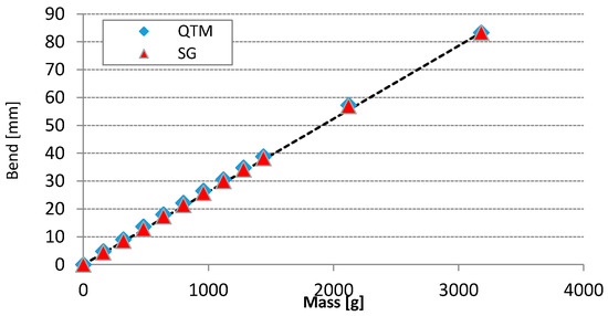 Front SG sensor calibration and validation. The bend is measured directly by the QTM system and indirectly by the SG sensor. The horizontal axis shows the mass of the applied weight in [g], the vertical axis shows the bend of the club head in [mm].