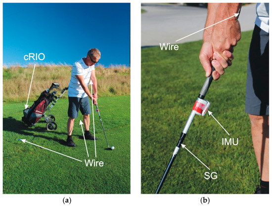 Field test. The movement of the golf club during a typical golf swing is recorded by the SG sensors and the IMU device. (a) SG sensors are connected by wire to the nearby cRIO device. (b) The IMU device is connected wirelessly to the nearby laptop (not shown in pictures).