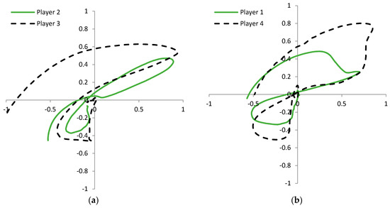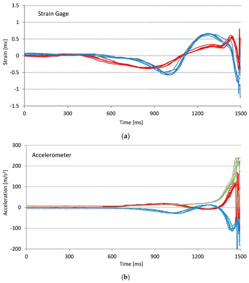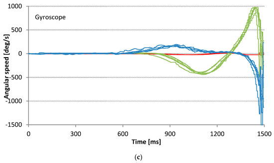 Apart from the repeatability and consistency, the graphs in Figure 10 show that all tested players have their characteristic and distinctive signal shapes—player’s signature. For example, the player in the graph in Figure 10b starts the swing at approximately 600 ms, while other players start the swing at approximately 200 ms and 400 ms. Similarly we can observe that players in graphs Figure 10a,c have a bounce in the red signal just before the impact, while the other two do not. Other similar examples can be derived from Figure 10.