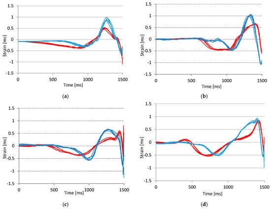 Player’s signatures of five successful consecutive swings of four different golf players: graphs (a,b) show swings of two experienced amateur players; graphs (c,d) show swings of two professional golf players. All graphs show the response of two orthogonally placed SG sensors, where blue plots represent the front sensor and red plots represent the side sensor. Signals show that each player has a distinctive sensor response (signature).
