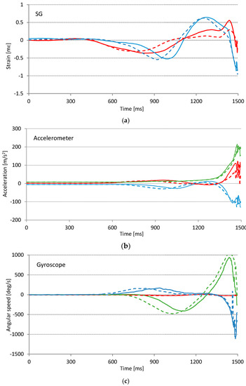 Another observation is that when comparing all the graphs in Figure 12, the SG sensors are the first that show any response (signals different from zero value) to the performed movement. The reason for this is that they represent the force applied to the golf club, while accelerometers and gyroscopes represent the response (the movement of the golf club). This observation supports the claim that SG sensors, being closer to the cause of the error, can be more suitable for technical error detection. Another advantage, especially for the real-time biofeedback, is that SG sensors show the error earlier in time and therefore allow enough time for possible swing interruption [11].