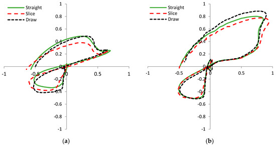 Comparison of 2D strain [mε] plot for regular swings and swings with technical errors of two professional golf players: (a) Player 1; (b) Player 4. Regular swings (straight) differ from swings with technical errors (slice, draw) in one or more swing phases. We expect the identification of technical errors is possible. The strain in both axes is given in [mε]. The horizontal axis shows the strain of the front sensor and the vertical axis shows the strain of the side sensor.
