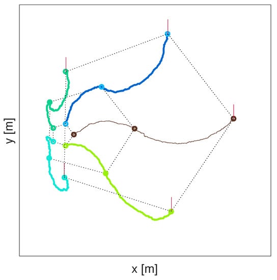 and the actual pose (perturbed by process noise) at the previous sensing time , i.e., . Without the correction term C, the platforms could drift and break the formation during the search time. Finally, is the covariance matrix which accounts for stochastic disturbances in motion. Figure 1 illustrates a simulated path of a robot formation based on the described motion model. In this illustration, the formation of robots is expanding (the scales are , and ). Note that, despite random individual paths, the formation at measurement time instants is almost a perfect pentagon. Apart from some randomness due to process noise, the motion model keeps the formation with the fixed bearings relative to its centre and a fixed north (i.e., the formation does not rotate).