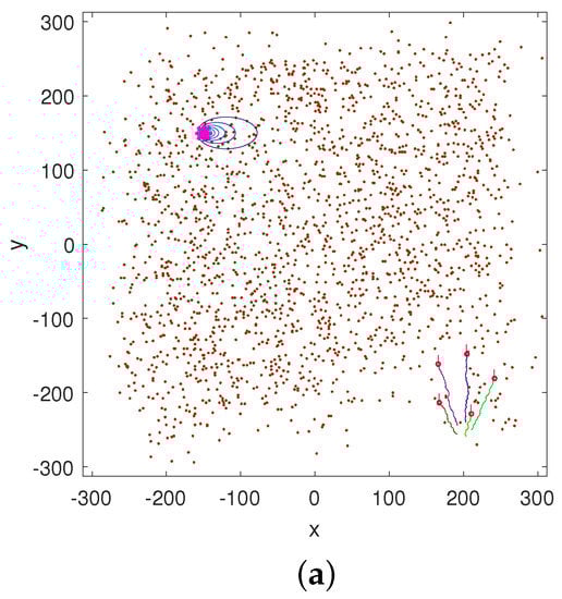 The initial position of the centroid of the formation was at . The results of a typical run are shown in Figure 2. Figure 2a shows the search area, the paths of the multi-robot formation at and the source location at with the contour plot of the corresponding mean rate of (3). The random samples , approximating the posterior , are shown as brown dots. Note that the search area is more than ten times bigger than the area where the source can be sensed. Consequently, the measurements are initially zero vectors for a long time; on this occasion for . At the first non-zero measurement is recorded by one of the sensors, resulting in the posterior PDF , approximated by the sample shown in Figure 2b. This figure also shows the search paths of the formation until the first detection. The search continues until , when the termination criterion is reached. The source parameter estimates at this stage are and . The posterior PDF of at is shown in Figure 2c. Note the narrow distribution of this posterior compared to the prior . The total search time of this run was 2092 a.u.