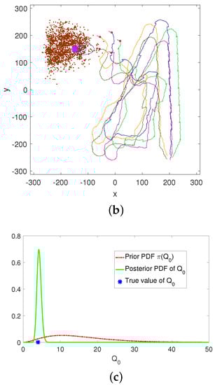 An illustrative run of the multi-robot search algorithm. Figures (a) and (b) show the search area, the paths of platforms, and the Monte Carlo samples (brown coloured dots) at and , respectively. The true source location is indicated by a pink asterisk. The contours of the mean plume are plotted with blue lines. Figure (c) shows the prior probability density function (PDF) (red dashed line), the posterior PDF at (green solid line), and the true value of (blue asterisk).