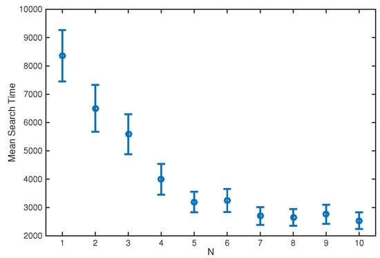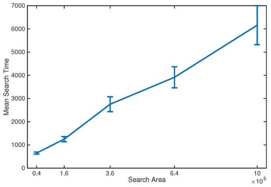 Figure 4 shows the mean search time when varying the side length of the search area in the range . The search was performed using platforms and both the source location and initial centroid position were again drawn at random from the uniform distribution over the search area. Over this range of side lengths, the mean search time is approximately linear in the area searched.