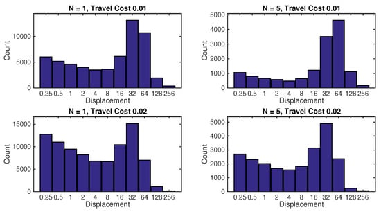 Figure 5 shows the effect of travel cost on the formation displacements chosen by the search algorithm. The travel cost , was increased from 0.01 to 0.02 and the results are shown for 1 and 5 search platforms. In accordance with intuition, increasing the travel cost results in a shift of the histogram towards smaller displacements. Another interesting observation can be made from Figure 5: the histograms clearly has two peaks. One corresponds to the short movements, while the other peak corresponds to the long “jumps” of 32 or more units in length. This appears to be very similar to the displacement patterns of foraging animals [2,33,34]. They too typically combine the phases of long non-sensing displacement, with short sensing (and reactive) search phases. This strategy is often referred to as intermittent search.
