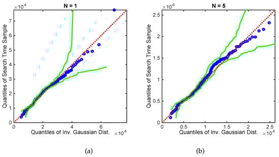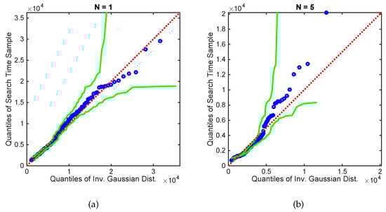 Experimental data: Q-Q plot of the search times for (a) and (b) versus the inverse Gaussian distribution with parameters fitted using maximum likelihood estimation. The source was placed as shown in Figure 7 and initial centroid position was fixed at . The green lines show 95% confidence bands [35].