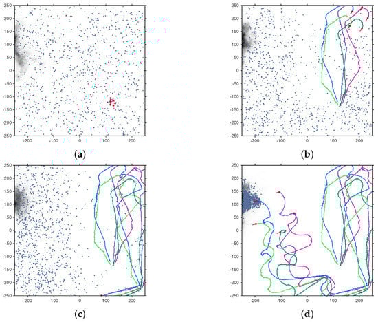 An illustrative run of the multi-robot search algorithm on the experimental dataset using platforms. (a–d) show the positions and trajectories of the platforms at times , 10, 20 and 30, respectively. The plume from the experimental dataset can be seen in the top left of the search area, with darker areas representing higher concentrations.