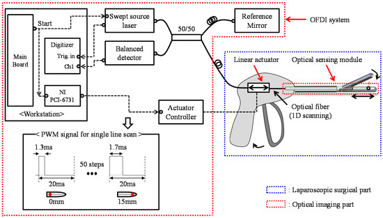 In an experiment, the mechanical movement of the optical sensing module was performed by using a linear servo actuator (PLS-5030, POTENIT, Seoul, Korea) for 15 mm transverse line scanning within 1 s. Generally, OFDI imaging requires a high-speed line scanning system (HSLS) for biomedical applications [5,6,7,8,9]. However, HSLS-based OFDI is not required for laparoscopic surgical applications because the sample is tightly fixed by the IGLaST head. Our proposed line scanning scheme with a linear servo actuator provides a low-cost and miniaturized device for practical use in laparoscopic surgical applications. To control the linear servo actuator, an NI PCI-6731 board (National Instruments, Austin, TX, USA) was equipped with a workstation, and pulse-width modulation (PWM) signals were generated as described in Figure 1.
