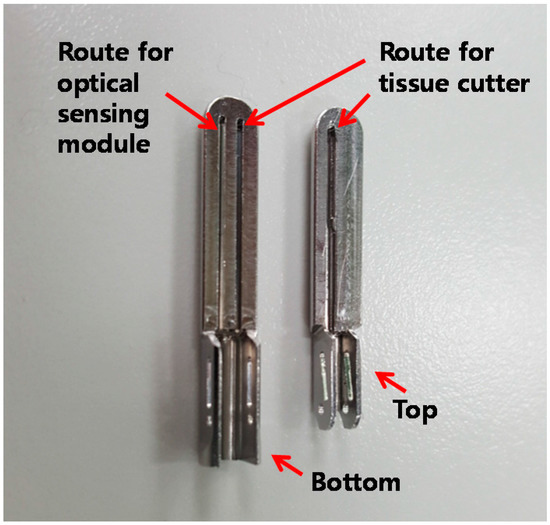 To apply the proposed method to a laparoscopic tissue dissector, we developed the IGLaST head with an optical sensing module and tissue cutter. The IGLaST head with biocompatible material (SUS304) contains two routes for the optical sensing module and tissue cutter, as shown in Figure 2. The size of the area for grasping the tissue is about 5.3 mm × 20 mm. Each route for the optical sensing module and tissue cutter has the same width of 0.5 mm, and the route for the optical sensing module has a length of 17 mm.