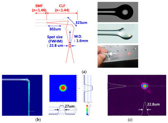 In order to transmit the laser beam into a sample, a ball-lens fiber functioning as a reflective mirror at the end of a fiber was manufactured, as shown in Figure 3a. This was predetermined by using a simulation tool (Light Tools, Synopsys, Mountain View, CA, USA) to satisfy a spot size (Full width at half maximum) of 27 µm at a working distance of 1.6 mm, as shown in Figure 3b. A coreless fiber (FG125LA, Thorlabs, Sterling, VA, USA) was fusion-spliced to the SMF (SMF-28, Corning, Corning, NY, USA) and cleaved to a predetermined length. Then, the distal end of the coreless fiber was heated, while being translated in a tungsten filament furnace to form a ball lens. The translation length and speed, the temperature of the filament, and the duration of heating were empirically adjusted to form the optimal ball-lens fiber. The entire ball lens fabrication process was performed at a computer-controlled fusion splicing workstation (GPX-3000, Vytran, Morganville, NJ, USA). To perpendicularly reflect the beam into the tissue, the distal tip of the ball lens was polished with a fiber polishing machine (Ultrapol, Ultra Tech., Santa Ana, CA, USA). The angle between the fiber axis and polished surface was about 39°. We confirmed the spot size (FWHM) of the beam was about 22.8 µm at a working distance of 1.6 mm by using a beam profiler (SP620U, Spiricon, Jerusalem, Israel), as shown in Figure 3c. The distance between the SMF/coreless fiber interface and front of the ball lens was 302 µm, and the coronal diameter of the ball lens was 323 µm.