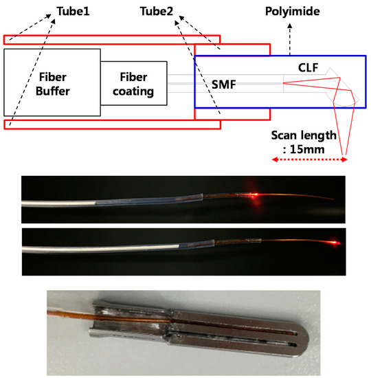 Figure 4 shows the structure of proposed optical sensing module. To protect the ball-lens fiber, a polyimide with an inner diameter of 350 µm and outer diameter of 390 µm was used. The polyimide was inserted into the groove on the bottom of the IGLaST head and secured with epoxy, as shown at the bottom of Figure 4. The rest of the ball-lens fiber was guided by Shrinkable Tube 1. Between the polyimide and Tube 1, Shrinkable Tube 2 was used as a spacer and had a smaller inner diameter than Tube 1. The length of Tube 1 was about 500 mm, which is similar to the length of a laparoscopic surgical tool. After the end of Tube 1, a linear servomotor was used for one-dimensional scanning of the ball-lens fiber. To minimize twisting or bending of the ball-lens fiber, the linear servomotor was placed close to the end of Tube 1.