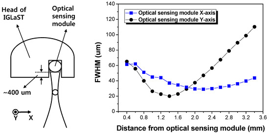 Figure 5 plots the experimentally measured beam diameter (FWHM) of the optical sensing module of IGLaST. The beam shape was measured by using a microscope equipped with an IR camera [15]. The beam diameter plot started at 400 µm considering the air gap between the optical sensing module and IGLaST head surface. The beam profile was elliptically shaped after passing through the polyimide. The ratio of the x-axis/y-axis crossed at the focal plane. The measured x- and y-axis beam diameters were 29.3 and 31.8 µm, respectively. The lateral resolution expected by the FWHM beam width ranged from 20 to 65 µm in the first 2 mm after the IGLaST head.