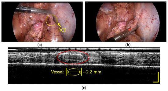 Figure 6 shows the in vivo imaging inside the fatty tissue of the pig with IGLaST. In laparoscopic surgery, tissues to be dissected should consist of adipose, lymphatics, and collagen, and blood vessels must be surrounded by the tissue complex. Therefore, the tissue complex that may cover major blood vessels of an artery or vein usually needs to be dissected to find them. In most cases, blood vessels inside the tissue are invisible, as shown in Figure 6a. We inserted our developed IGLaST inside the pig body through a trocar and grasped the tissue with the head of IGLaST to observe invisible blood vessels inside the tissue, as shown in Figure 6b. The red light is a guide source to inform the position of the head of the ball-lens fiber. The blood vessel inside the fatty tissue of the pig appeared with OFDI, as shown in Figure 6c. The yellow bar in Figure 6c represents a length of 0.5 mm. The size of the image was about 15 × 1.75 mm2. After the tissue was grasped, the tissue was compressed, and the thickness of the tissue was reduced to about 0.5–0.6 mm. In this experiment, a blood vessel with a length of about 2.2 mm was clearly observed.