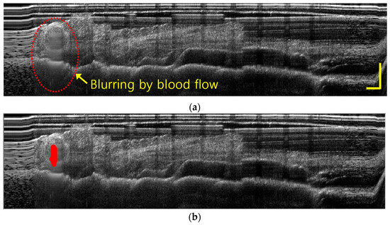 When the IGLaST head grasping the tissue was slightly released, image blurring occurred at the vessel position because of blood flow, as shown in Figure 7a. If the morphological image processing technique to extract blurring pixels is applied, the contrast can be increased to improve awareness of the blood vessels inside the tissue, as shown in Figure 7b. This technique provides the functions of erosion, smooth filtering, simple threshold, and area sort to isolate the blurred part [16]. IGLaST can be further improved to discriminate arteries and veins by the application of Doppler and angiographic techniques [17,18,19].
