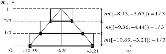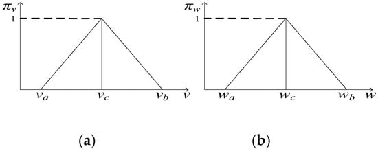 where the relationship between state xk+1 at time k + 1 and state xk at time k is described as function f. The relationship between observation zk+1 at time k + 1 and state xk+1 at time k + 1 is described as function g. vk and wk are bounded additive state noise variable and observation noise variable respectively, which are independent of each other. These two noises can be approximated to triangle possibility distributions [], noted as πv and πw, respectively, (the noise distributions are identical at each time step), as shown in Figure 2.