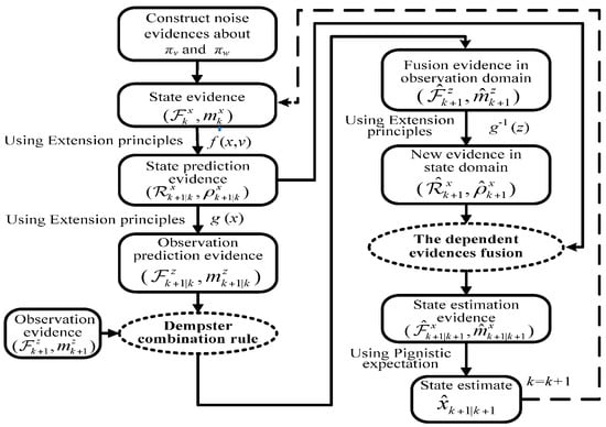 Thus, taking  and  as the inputs of state equation , we can get the state prediction evidence  by mapping from the inputs to the outputs based on the extension principles in Equations (13) and (14).