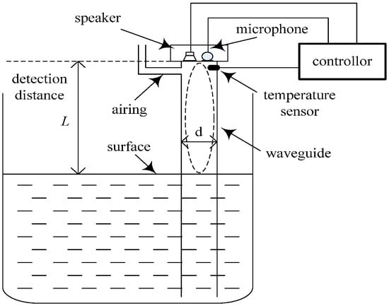 Level measurement methods based on sound reflection phenomena have been successfully applied in some areas of process industry (chemical, waste water treatment, petroleum, etc.) because the level is the main monitored process variable used in industrial alarm systems. Ultrasonic measurement methods, with good directivity, convenient operation and so on, have become some of the most commonly used techniques []. Their measuring principle is to emit an ultrasound toward a liquid surface and receive the echos, then to calculate the distance from the surface to the acoustic receiver device by multiplying the sound velocity by the round-trip time []. However, this method is susceptible to the quality of the instrument itself and environmental noise, which will deteriorate the measurement accuracy. Besides, if the ultrasound encounters foams, residues, deposits, etc., in the measurement process, it is also prone to parasitic reflection, thereby the ultrasound propagation path is changed, which seriously affects the measurement accuracy [].