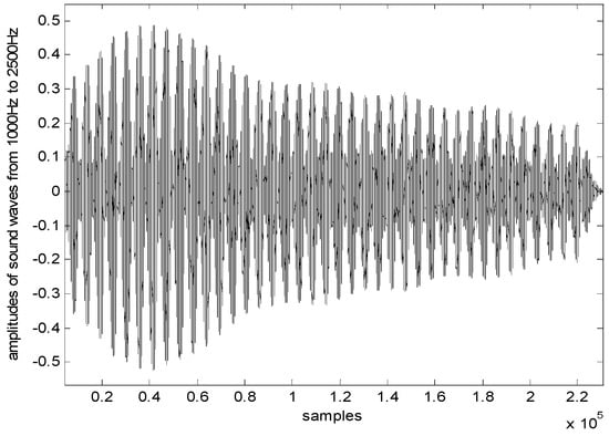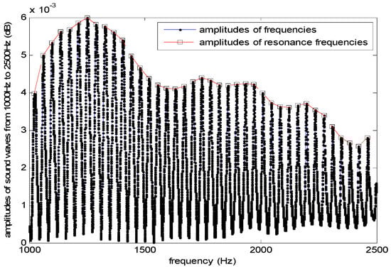 If the frequency range [fL,fH] is [1000 Hz, 2500 Hz], then there are 82 resonance frequencies in this range, k = 1, 2,⋯, 82, and nk = 56,57,⋯,137. Consequentially, f1 = 56 × 18 Hz, f2 = 57 × 18 Hz,⋯, f82 = 137 × 18 Hz.