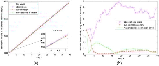 From Figure 7, it can be seen that the first observation value of resonance frequency z1 = 1023.3 Hz. According to Step 2) in Section 3.2, the first estimation result  is initialized as the real observation z1. After obtaining  and , our recursive algorithm presented in Section 3.2 can be used to estimate resonance frequencies at each step k. Figure 10a gives the estimation results of our method and Nassreddine’s method, together with the true values and observations (zk). Figure 10b gives the absolute errors between true values and the estimated values of our method, the estimated values of Nassreddine’s method, and zk respectively. It can be seen that the estimation accuracy and convergence of our method are better than those of Nassreddine’s method because of the focusing function of the proposed fusion procedure for dependent evidence.