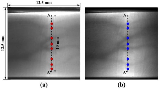 IR sensor images (12.5 mm × 12.5 mm) of an index finger vein using (a) the LED array, and (b) the laser with the MEMS scanner; the circular dots represent the detected maximum values of the curvature on the vein image.
